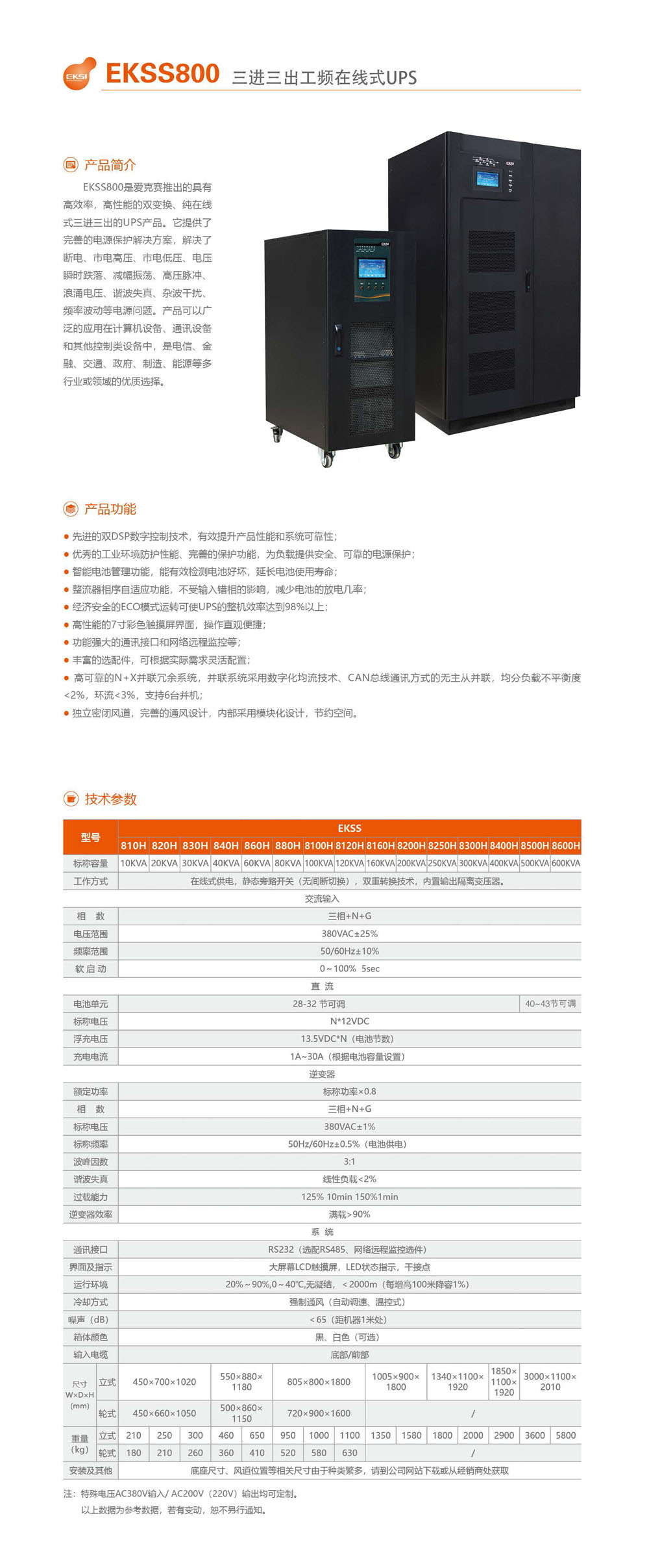 EKSI愛克賽全系列電源產(chǎn)品——愛克賽EKSS800系列塔式三進三出工業(yè)級工頻在線式UPS電源
